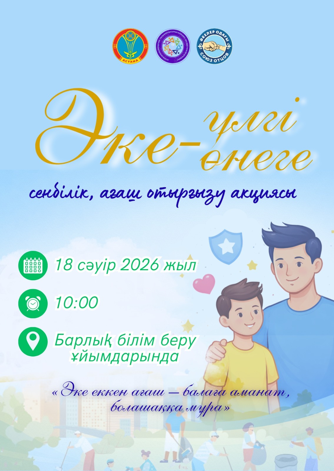 18 апреля 2026 года Детско-юношеским центром физического воспитания «Өркен» акимата города Астана в рамках республиканской акции «Таза Қазақстан» была организована и проведена акция по посадке деревьев «Әке - үлгі, әке - өнеге». Данная акция является важной инициативой направленной на формирование у подрастающего поколения качеств трудолюбия, культуры чистоты и уважительного отношения к родной земле. В акции активное участие приняли сотрудники Детско-юношеского центра физического воспитания «Өркен», тренерско-преподавательский состав, родители, отцы учащихся занимающихся в спортивных секциях центра и юные воспитанники центра.